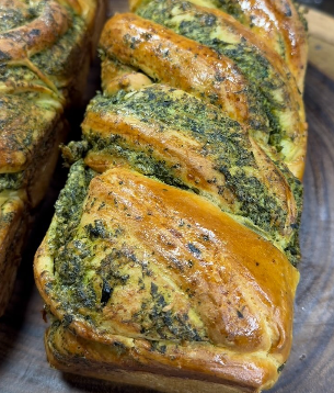 4. Modelando a babka: Abra a massa em um retângulo grande, de aproximadamente 35×25 cm, sobre uma superfície enfarinhada. Espalhe a manteiga de ervas por toda a superfície, deixando um dedinho de borda. Enrole como um rocambole, bem apertadinho, no sentido do comprimento.