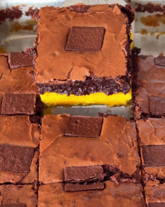 3. Montagem final: Assim que o bolo estiver assado (mas ainda quente), espalhe a massa de brownie por cima com cuidado. Coloque por cima os quadradinhos de chocolate para derreterem junto e volte ao forno por mais 10 a 15 minutos.