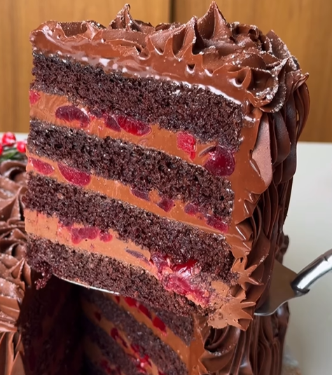 Repita o processo com as demais camadas de bolo, sempre umedecendo levemente e acrescentando recheio e cerejas.