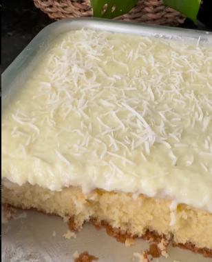 - Retire o bolo do forno e, ainda quente, despeje uniformemente a calda de coco por cima.