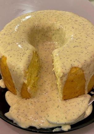 - Quando o bolo estiver assado e levemente morno, espalhe a cobertura por cima.