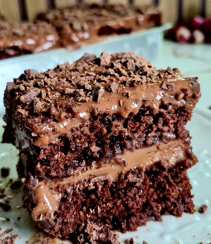 Você pode usar a sua receita preferida de bolo de chocolate, aquela já testada e aprovada. Uma sugestão de massa simples para forma 18×28 cm: