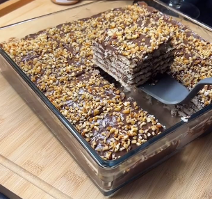 4. Finalize com charme: Despeje essa cobertura sobre o bolo já montado e polvilhe as castanhas ou amêndoas trituradas por cima. Cubra com um prato ou tampa e leve à geladeira por pelo menos 3-4 horas. Se puder deixar de um dia para o outro, melhor ainda! O biscoito vai absorver todo o sabor do creme, criando uma textura maravilhosa.
