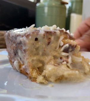Bata os ingredientes da calda final no liquidificador até formar um creme liso. Espalhe sobre o bolo gelado, finalize com mais coco ralado por cima e volte à geladeira até a hora de servir.