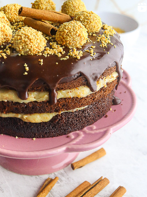 Além de saboroso, é um bolo vistoso, que chama atenção na mesa e conquista pelo recheio generoso e pela ganache brilhante. E os brigadeiros de churros, então? São a cereja do bolo — ou melhor, o toque da vovó.