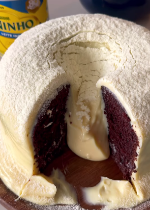 Esta mistura é a “lava” do nosso vulcão! Despeje essa cobertura generosamente sobre o bolo desenformado e finalize peneirando um pouco de leite em pó por cima. Hummm, essa parte é de deixar qualquer um com água na boca!