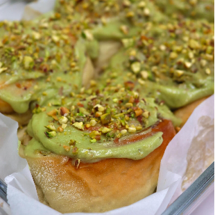 Misture o cream cheese vegano, manteiga vegana amolecida, açúcar de confeiteiro e baunilha até formar uma cobertura homogênea. Depois que os cinnamon rolls estiverem mornos, espalhe generosamente a cobertura e decore com pistaches picados.