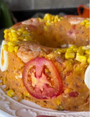 Unte uma forma com azeite. No fundo, distribua artisticamente as rodelas de ovo, os camarões reservados, o restante do milho e algumas rodelas de tomate. Essa decoração vai aparecer linda depois de desenformado! - Hora de dar liga