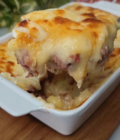 Leve o Escondidinho de Carne Seca com Mandioca ao forno pré-aquecido a 180 graus por aproximadamente 20 minutos ou até gratinar.