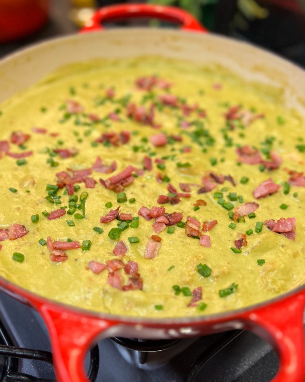 - Aqueça novamente, se necessário, e sirva salpicado com cebolinha, parmesão ralado e bacon tostadinho por cima.