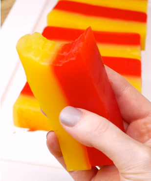 Depois que a parte vermelha estiver firme, despeje delicadamente a parte amarela por cima, com cuidado para não misturar as camadas. Leve novamente à geladeira por mais 1 a 2 horas, ou até tudo estar bem firme.