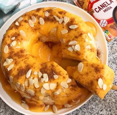Depois de frio, desenforme o Molotof com cuidado e regue com o doce de ovos ainda morno. Finalize com uma leve polvilhada de canela em pó e amêndoas laminadas tostadas.