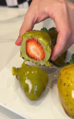 O Morango do Amor de Pistache é uma releitura moderna e requintada da clássica guloseima de festa junina. Nesta versão, o sabor sofisticado do pistache se une à delicadeza do brigadeiro e ao frescor do morango, tudo envolvido por uma casquinha brilhante e crocante de caramelo levemente tingida em verde pistache. Uma combinação que derrete na boca e conquista pelo contraste de texturas.