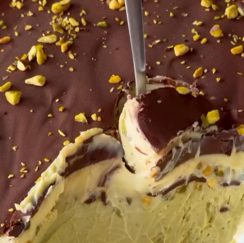 Retire da geladeira e finalize essa camada com os pistaches picados por cima.