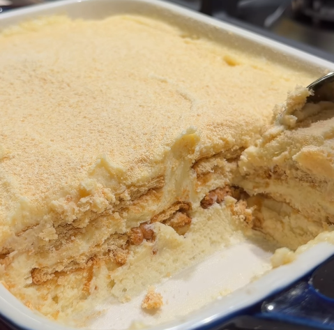 Leve o Pavê de Farinha Láctea à geladeira por cerca de 4 horas para ficar bem firme.