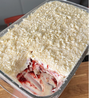- Cubra com raspas de chocolate branco e alguns morangos frescos para decorar.