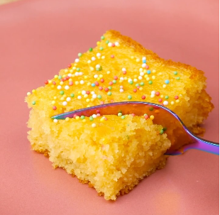 Após retirar o bolo do forno, espere esfriar ligeiramente, desenforme e corte em quadradinhos de tamanhos iguais. Regue delicadamente com a calda de maracujá e decore com os confeitos que preferir. Eu particularmente gosto muito das sementes naturais do maracujá, que dão aquele toque bonito e elegante.