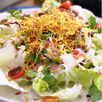 5. Montagem da Salada: Em uma travessa bem bonita, coloque uma cama de alface americana, espalhe os tomatinhos cereja cortados ao meio, as cebolas suavizadas, o bacon crocante, a batata palha e finalize com a salsinha picada. Regue com o molho refrescante de iogurte e finalize com um fio generoso de molho tarê.