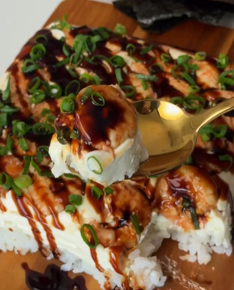 Para montar, forre um recipiente ou forma com alga nori, coloque uma camada de arroz, espalhe o cream cheese, adicione os camarões e finalize com mais arroz. Pressione levemente para compactar.