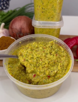 - Bater os ingredientes: Coloque todos os ingredientes no liquidificador ou processador, começando pelo azeite (cerca de ½ xícara), depois o alho, cebola, ervas e por fim as especiarias. Bata até formar uma pasta homogênea. Se necessário, adicione mais azeite aos poucos para facilitar a mistura.