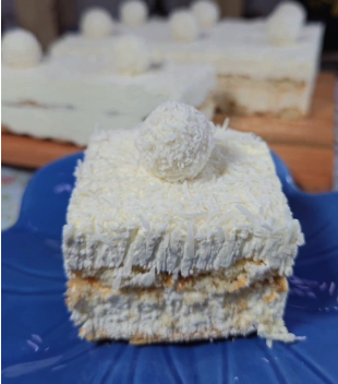 Nesta versão da vovó, o toque brasileiro se faz presente com o leite de coco e o coco ralado, além do chocolate branco, que combina perfeitamente com a proposta dos bombons Raffaello. É uma releitura encantadora, moderna, mas com a alma da confeitaria afetiva.