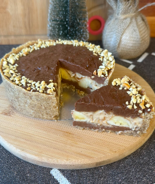 Montagem: Com a base já fria, espalhe uma camada fina da ganache. Coloque as rodelas de banana sobre a ganache. Cubra com o creme de amendoim e finalize com o restante da ganache por cima. Decore com amendoim triturado nas bordas.
