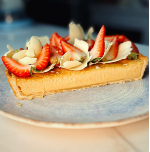 - Uma bola de sorvete de baunilha ou nata batida combina perfeitamente com a textura da torta e o contraste do frescor das frutas.