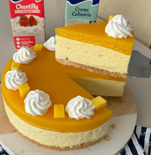 Bata os 400 g de manga no liquidificador até obter um purê liso. Passe por uma peneira para remover as fibras. Hidrate e dissolva os 8 g de gelatina conforme instruções da embalagem e misture imediatamente ao purê de manga ainda fresco. Em um bowl, coloque o creme culinário e o chocolate branco. Leve ao micro-ondas de 30 em 30 segundos, mexendo a cada pausa, até tudo estar derretido e homogêneo. Incorpore ao purê de manga e espere amornar. Por fim, bata o chantilly (bem gelado) até ponto firme e incorpore delicadamente ao creme de manga. Despeje essa mistura sobre a base assada e leve à geladeira por 2 horas, ou até firmar.
