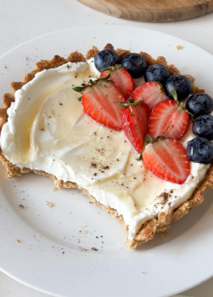 Quando a base estiver completamente fria, recheie com o iogurte drenado. Se quiser, adoce o recheio com mel ou adoçante natural e acrescente um pouco de whey protein para enriquecer com proteína. Finalize com frutas vermelhas frescas, um fio de mel e, se desejar, uma pitada de baunilha em pó.