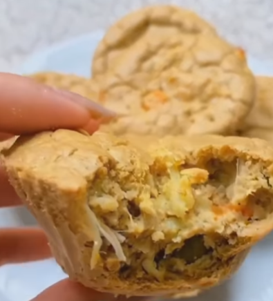 - Montagem das Tortinhas: Pré-aqueça o forno a 180 graus. Em forminhas, coloque um pouco da massa no fundo, siga com uma colher do recheio de frango e finalize com mais massa por cima. Lembre-se: a massa deve cobrir o recheio.